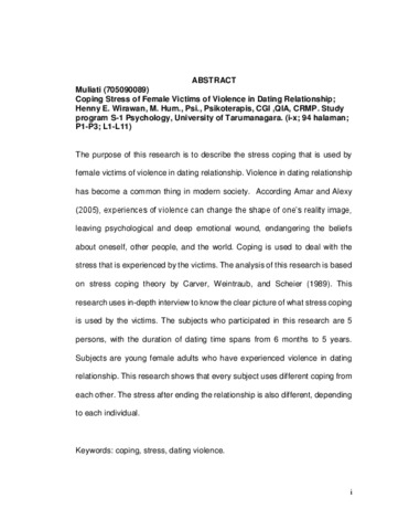 The purpose of this research is to describe the stress coping that is used by female victims of violence in dating relationship. Violence in dating relationship has become a common thing in modern society. According Amar and Alexy (2005), experiences of violence can change the shape of one’s reality image, leaving psychological and deep emotional wound, endangering the beliefs about oneself, other people, and the world. Coping is used to deal with the stress that is experienced by the victims. The analysis of this research is based on stress coping theory by Carver, Weintraub, and Scheier (1989). This research uses in-depth interview to know the clear picture of what stress coping is used by the victims. The subjects who participated in this research are 5 persons, with the duration of dating time spans from 6 months to 5 years. Subjects are young female adults who have experienced violence in dating relationship. This research shows that every subject uses different coping from each other. The stress after ending the relationship is also different, depending to each individual.