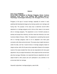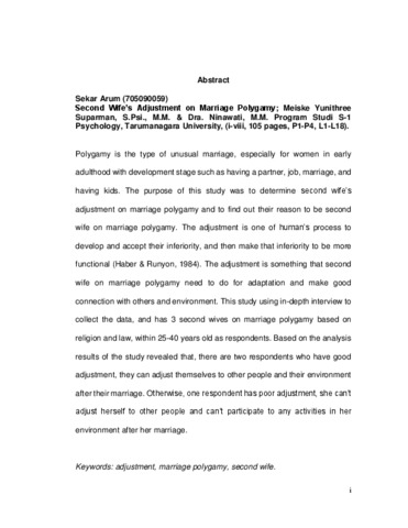 Arum, Sekar (2014) Penyesuaian Diri Isteri Kedua Pada Pernikahan Poligami. Skripsi thesis, Universitas Tarumanagara.
