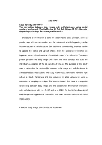 Jofendy, Lisya (2014) Hubungan antara body image dengan self-disclosure pada remaja putri pengguna sosial media. Skripsi thesis, Universitas Tarumanagara.