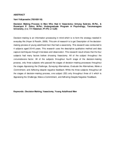 Vidiyarastie, Vani (2014) Prose pengambilan keputusan pada pria yang telah melakukan vasektomi. Skripsi thesis, Universitas Tarumanagara.