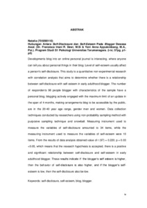 Developments blog into an online personal journal is interesting, where anyone can tell you about personal things in their blog. Level of self-esteem usually affect a person's self-disclosure. This study is a quantitative non-experimental research with correlation analysis that aims to determine whether there is a relationship between self-disclosure with self-esteem in early adulthood blogger. The number of respondents 98 people blogger with characteristics of the sample have a personal blog, blogging actively engaged with the maximum limit of an update in the span of 4 months, making arrangements blog to be accessible by the public, are in the 20-40 year age range, gender men and women. Data collection techniques conducted by researchers using non-probability sampling method with purposive sampling technique and snowball. Measuring instrument used to measure the variables of self-disclosure amounted to 34 items, while the measuring instrument used to measure the variables of self-esteem were 10 items. From the results of data analysis obtained value of r (97) = 0.220; p = 0.03 <0.05, which means that the research hypothesis is accepted, there is a positive and significant relationship between self-disclosure and self-esteem in early adulthood blogger. These results indicate if the blogger’s self esteem is higher, then the behavior of self-disclosure is also higher, and if the blogger’s self-esteem is low, then the self-disclosure also be low.