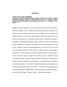 Alfani, Violeta Patricia (2014) Gambaran dukungan social ibu terhadap anak yang memiliki kesulitan belajar membaca (Dyslexia). Skripsi thesis, Universitas Tarumanagara.