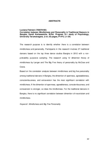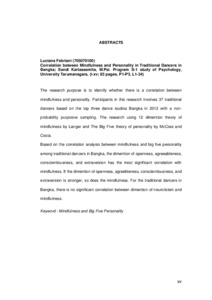 "The research purpose is to identify whether there is a correlation between mindfulness and personality. Participants in this research involves 37 traditional dancers based on the top three dance studios Bangka in 2012 with a non-probability purposive sampling. The research using 12 dimention theory of mindfulness by Langer and The Big Five theory of personality by McCrae and Costa.