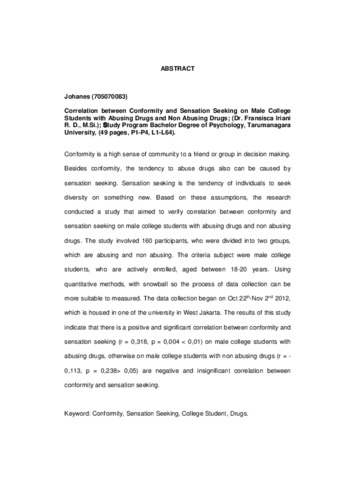 Conformity is a high sense of community to a friend or group in decision making. Besides conformity, the tendency to abuse drugs also can be caused by sensation seeking. Sensation seeking is the tendency of individuals to seek diversity on something new. Based on these assumptions, the research conducted a study that aimed to verify correlation between conformity and sensation seeking on male college students with abusing drugs and non abusing drugs. The study involved 160 participants, who were divided into two groups, which are abusing and non abusing. The criteria subject were male college students, who are actively enrolled, aged between 18-20 years. Using quantitative methods, with snowball so the process of data collection can be more suitable to measured. The data collection began on Oct 22th-Nov 2nd 2012, which is housed in one of the university in West Jakarta. The results of this study indicate that there is a positive and significant correlation between conformity and sensation seeking (r = 0,318, p = 0,004 < 0,01) on male college students with abusing drugs, otherwise on male college students with non abusing drugs (r = -0,113, p = 0,238> 0,05) are negative and insignificant correlation between conformity and sensation seeking.
