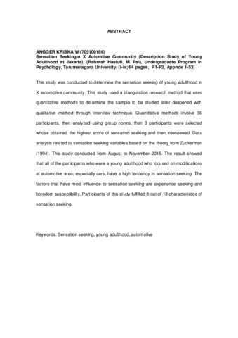 This study was conducted to determine the sensation seeking of young adulthood in X automotive community. This study used a triangulation research method that uses quantitative methods to determine the sample to be studied later deepened with qualitative method through interview technique. Quantitative methods involve 36 participants, then analyzed using group norms, then 3 participants were selected whose obtained the highest score of sensation seeking and then interviewed. Data analysis related to sensation seeking variables based on the theory from Zuckerman (1994). This study conducted from August to November 2015. The result showed that all of the participants who were a young adulthood who focused on modifications at automotive area, especially cars, have a high tendency to sensation seeking. The factors that have most influence to sensation seeking are experience seeking and boredom susceptibility. Participants of this study fulfilled 8 out of 13 characteristics of sensation seeking.