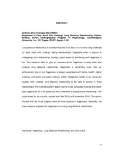 Long distance relationship is a relationship that is not easy to run and is a big challenge for early adult who undergo dating relationships. Especially when a person is undergoing such relationships lacking a good sense of well-being and happiness in her. This research aims to give an overview about happiness of early adult who undergo long distance relationship. Happiness is something more than an achievement due in fact happiness is always associated with better health, higher creativity and better workplace (Diener, 2005). Happiness needs to be owned by couples who undergo long distance relationship to be able to persist in living relationships. The method called in-depth interview was conducted towards three early adult (aged from 20 to 40 years old) who underwent a long distance relationship. This study lasted for six months, started from Mei 2016 until November 2016. The results showed that the three subjects have all three aspects of happiness. Generally, the three subjects experienced happiness in running long distance relationship.