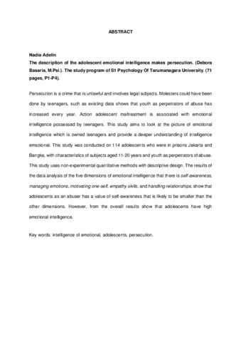 Adelin, Nadia (2016) Gambaran profil kecerdasan emosional pada remaja yang melakukan penganiayaan. Skripsi thesis, Universitas Tarumanagara.