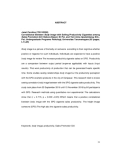 Caroline, Janet (2016) Hubungan antara body image dengan produktivitas penjualan rokok pada sales promotion girl. Skripsi thesis, Universitas Tarumanagara.