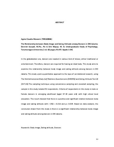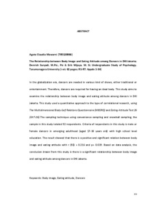 Mawarni, Agata Claudia (2016) Hubungan body image dan eating attitude pada penari di DKI Jakarta. Skripsi thesis, Universitas Tarumanagara.