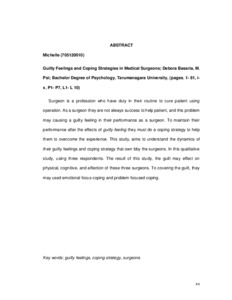 Surgeon is a profession who have duty in their routine to cure patient using operation. As a surgeon they are not always success to help patient, and this problem may causing a guilty feeling in their performance as a surgeon. To maintain their performance after the effects of guilty feeling they must do a coping strategy to help them to overcome the experience. This study, aims to understand the dynamics of their guilty feelings and coping strategy that own bby the surgeons. In this qualitative study, using three respondents. The result of this study, the guilt may effect on physical, cognitive, and affection of these three surgeons. To covering the guilt, they may used emotional focus coping and problem focused coping.