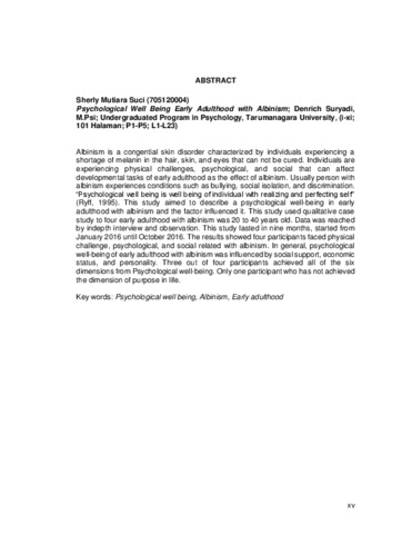 Albinism is a congential skin disorder characterized by individuals experiencing a shortage of melanin in the hair, skin, and eyes that can not be cured. Individuals are experiencing physical challenges, psychological, and social that can affect developmental tasks of early adulthood as the effect of albinism. Usually person with albinism experiences conditions such as bullying, social isolation, and discrimination. “Psychological well being is well being of individual with realizing and perfecting self” (Ryff, 1995). This study aimed to describe a psychological well-being in early adulthood with albinism and the factor influenced it. This study used qualitative case study to four early adulthood with albinism was 20 to 40 years old. Data was reached by indepth interview and observation. This study lasted in nine months, started from January 2016 until October 2016. The results showed four participants faced physical challenge, psychological, and social related with albinism. In general, psychological well-being of early adulthood with albinism was influenced by social support, economic status, and personality. Three out of four participants achieved all of the six dimensions from Psychological well-being. Only one participant who has not achieved the dimension of purpose in life.