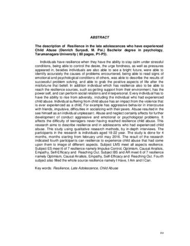 Individuals have resilience when they have the ability to stay calm under stressful conditions, being able to control the desire, the urge fondness, as well as pressures appeared in, besides individuals are also able to see a bright future, were able to identify accurately the causes of problems encountered, being able to read signs of emotional and psychological conditions of others, was able to describe the results of successful problem solving, and able to grab the positive aspects of life after the misfortune that befell. In addition individual which has resilience also to be able to reach the resilience sources, such as getting support from their environment, has the power self, and can perform social relations and interpersonal. Every individual has to have the ability to rise from adversity, including the individual who had experienced child abuse. Individual suffering from child abuse has an impact from the violence that is ever experienced as a child, For example has aggressive behavior in intercourse with friends, impulsive, difficulties in socializing with their peers. Abuse resulted in the see himself as an individual unpleasant. Abuse and neglect certainly affects for further development of conduct aggressive and emotional or psychological problems. It affects the difficulty of teenagers never having reached resilience child abuse. This research aims to describe resilience end in adolescents who had experienced child abuse. This study using qualitative research methods, by in-depth interviews. The participants in the research is individuals aged 18-22 year. The study is done for 4 months, months starting from february until may 2016. The result of the research indicated fourth participants can resilience to experience child abuse that had come upon them to image of different aspects. Subject LMS meet all aspects resilience. Subject ES meet 6 of 7 resilience namely Impulse Control, Optimism, Causal Analisis, Empathy, Self-Efficacy and Reaching Out. Subject BS and AR meet 6 of 7 resilience namely Optimism, Causal Analisis, Empathy, Self-Efficacy and Reaching Out. Fourth subject also filled the whole source resilience namely I Have, I Am and I Can.