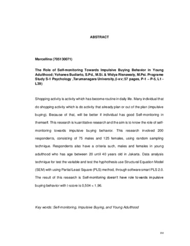 Marcellina, Marcellina (2017) Peran pemantauan diri terhadap perilaku pembelian impulsif pada dewasa muda. Skripsi thesis, Universitas Tarumanagara.