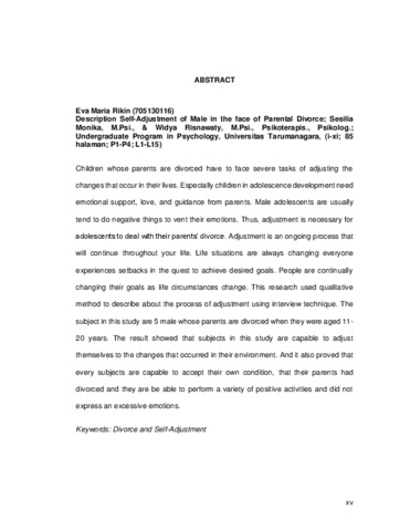 Rikin, Eva Maria (2017) Gambaran penyesuaian diri laki-laki dalam menghadapi perceraian orangtua. Skripsi thesis, Universitas Tarumanagara.