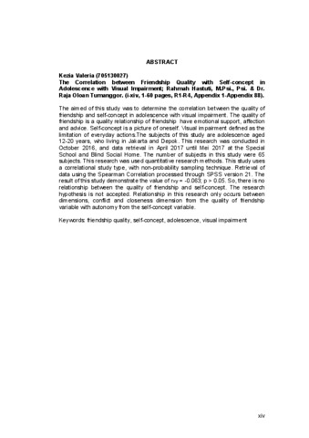 limitation of everyday actions.The subjects of this study are adolescence aged 12-20 years, who living in Jakarta and Depok. This research was conducted in October 2016, and data retrieval in April 2017 until Mei 2017 at the Special School and Blind Social Home. The number of subjects in this study were 65 subjects. This research was used quantitative research methods. This study uses a correlational study type, with non-probability sampling technique. Retrieval of data using the Spearman Correlation processed through SPSS version 21. The result of this study demonstrate the value of rxy = -0.063; p > 0.05. So, there is no relationship between the quality of friendship and self-concept. The research hypothesis is not accepted. Relationship in this research only occurs between dimensions, conflict and closeness dimension from the quality of friendship variable with autonomy from the self-concept variable."