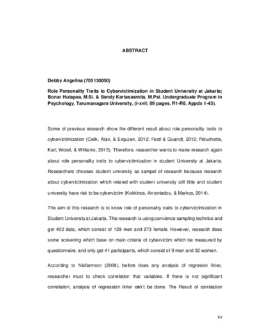 The aim of this research is to know role of personality traits to cybervictimization in Student University at Jakarta. This research is using convience sampling technice and get 402 data, which consist of 129 men and 273 female. However, research does some screening which base on main criteria of cybervictim which be measured by questionnaire, and only get 41 participants, which consist of 9 men and 32 women.