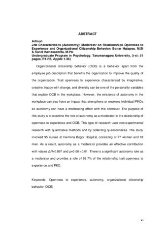 Arfinah, Arfinah (2017) Karakteristik pekerjaan (otonomi): moderator hubungan openness to experience dan perilaku kewargaan organisasional. Skripsi thesis, Universitas Tarumanagara.
