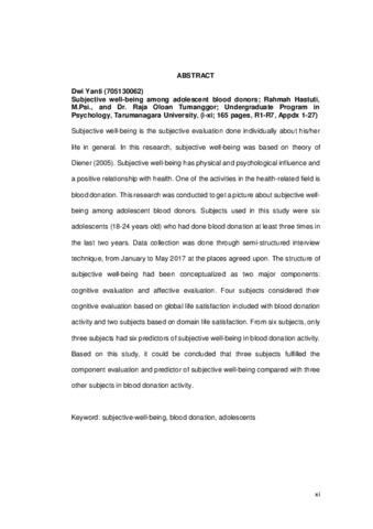 Yanti, Dwi (2017) Gambaran subjective well being pada pendonor darah remaja. Skripsi thesis, Universitas Tarumanagara.
