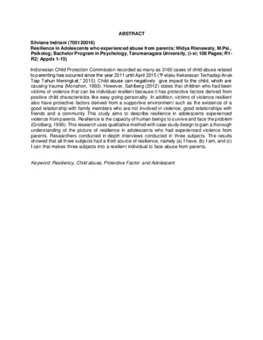 Indriani, Silvina (2016) Gambaran resiliensi pada remaja yang mengalami kekerasan dari orangtua. Skripsi thesis, Universitas Tarumanagara.
