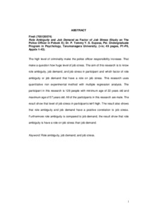 The high level of criminality make the police officer responsibility increase. That make a question how huge level of job stress. The aim of this research is to know role ambiguity, job demand, and job stress in participant and which factor of role ambiguity or job demand that have a role on job stress. This research uses quantitative non experimental method with multiple regression analysis. The participant in this research is 128 people with minimum age of 22 years old and maximum age of 57 years old. All of the participants in this research are male. The result show that level of job stress in participants isn’t high. The result also shows that role ambiguity and job demand have a positive correlation to job stress. Furthermore role ambiguity is compared to job demand, the result show that role ambiguity is have a role on job stress than job demand.
