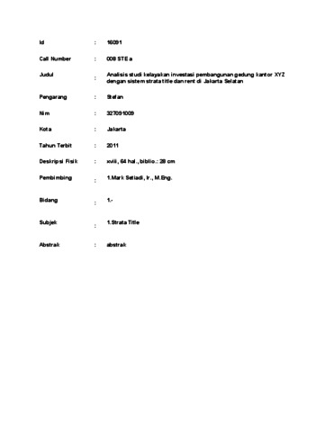 Stefan, Stefan (2011) Analisis studi kelayakan investasi pembangunan gedung kantor XYZ dengan sistem strata title dan rent di Jakarta Selatan. Masters thesis, Universitas Tarumanagara.