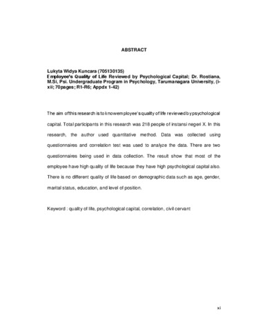 Kuncara, Lukyta Widya (2017) Gambaran kualitas hidup karyawan ditinjau dari modal psikologis. Skripsi thesis, Universitas Tarumanagara.
