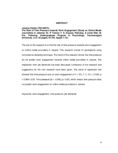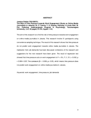 Odelia, Jessica (2017) Peranan time pressure terhadap work engagement (studi pada wartawan media online di Jakarta). Skripsi thesis, Universitas Tarumanagara.