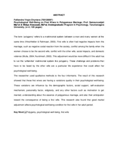 "The term ‘polygamy’ refers to a matrimonial system between a man and many women at the same time (Hirschfelder & Rahmaan, 2003). First wife is often had negative impacts from this marriage, such as negative social reaction from the society, conflict among the family when the women choose to be the second wife, conflict with the other wife, social impacts, and domestic violence (Mulia, 2004; Nurohmah, 2003). This adjustment would be more difficult if the adult has to run the ‘unfamiliar’ matrimonial system like polygamy. These challenge and problems that have to be faced by the other wife are a particular life experience that could affect her psychological well-being.