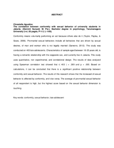 Conformity means voluntarily performing an act because others also do it (Taylor, Peplau, & Sears, 2006). Pre-marital sexual behaviors include all behaviors that are driven by sexual desires, of man and woman who is not legally married (Sarwono, 2012). The study was conducted on 403 late adolescents. Characteristics of sample aged between 18-25 years old, is having a romantic relationship with the oopposite sex, and currently live in Jakarta. This study uses quantitative, non experimental, and correlational design. The results of data analyzed using Spearman correlation test showed that r( 403 ) = .389 and p = .000. Based on calculations, it can be concluded that there is a significant positive relationship between conformity and sexual behavior. The results of this research shows that the increased of sexual behavior is affected by conformity, and vice versa. The average of pre-marital sexual behavior of all respondent is high, but the highest score based on the sexual behavior dimension is touching.