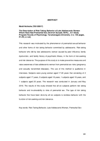 Helinsha, Maidi (2016) Gambaran rist taking behavior pada remaja akhir yang telah melakukan hubungan seks pranikah. Skripsi thesis, Universitas Tarumanagara.