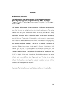 This research was motivated by the phenomenon of premarital sexual behavior and other forms of risk taking behavior committed by adolescents. Risk-taking behavior who did by late adolescents woman caused by peer influence, family dysfunction, and family history of psychiatric illness, in the form of risk-seeking and risk tolerance. The purpose of this study is to make preventive measures and raise awareness of late adolescents woman from premarital sex risks (pregnancy and sexually transmitted diseases). The use of this method is qualitative in interviews. Subjects were young woman aged 17-20 years that consisting of 2 subjects aged 17 years, 2 subjects aged 18 years, 1 subjects aged 19 years, and 1 subjects aged 20 years. The research was conducted in January and May 2016. The results of this study showed that all six subjects perform risk taking behavior and invulnerability to risks of premarital sex. The type of risk taking behavior that have been done by all six subjects is reckless behavior with the function of risk seeking and risk tolerance.
