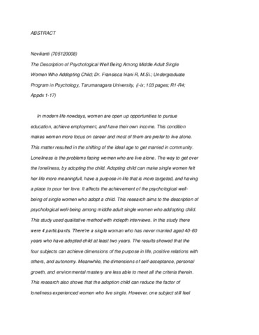Novilianti, Novilianti (2016) Gamabran kesejahteraan psikologis wanita dewasa madya lajang yang mengadopsi anak. Skripsi thesis, Universitas Tarumanagara.