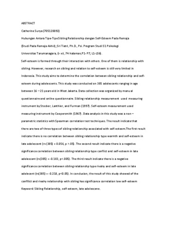 Surya, Cathrine (2016) Hubungan antara tipe-tipe sibling relationship dengan self-esteem pada remaja. Skripsi thesis, Universitas Tarumanagara.