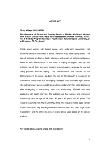 Middle aged women with breast cancer who underwent mastectomy had emotional changes that leads to stress, therefore they need coping stress. The sign of stresses are fear of death, sadness, and anxiety of getting mestastase. There is also differentiation in the used of coping strategies used by four subjects, two of them are using emotion focused coping, whereas the rest are using problem focused coping. This differentiations are caused by the differentiation in the cancer stadium. The aim of this research is to present an overview of stress faced and the coping strategies used by middle aged women who suffers breast cancer, notably during the periods when they were diagnosed, after undergoing a mastectomy, and post mastectomy. Method used was qualitative with depth interview. The subjects are four women who underwent mastectomy with the age of 54 years, 46 years, 47 years, and 45 years. This research was held from March until May 2016. The result is middle aged woman faced stress when they are diagnosed with breast cancer and need to go under mastectomy, and the differentiations of coping stress used based on the cancer stadium.