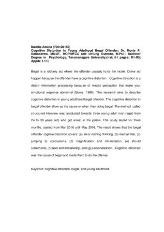 Amelia, Nandia (2016) Gambaran cognitive distortion pada dewasa muda pelaku begal. Skripsi thesis, Universitas Tarumanagara.