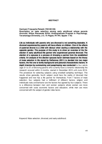 Tripuspita Patasik, Gantyani (2016) Gambaran pemilihan pasangan hidup pada dewasa awal yang mengalami penceraian orangtua. Skripsi thesis, Universitas Tarumanagara.
