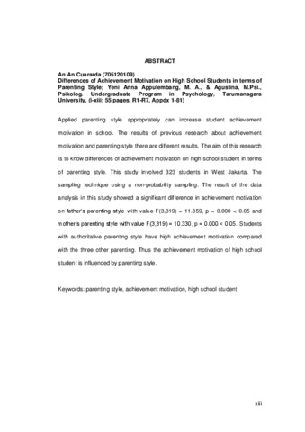 An Cuararda, An (2016) Perbedaan motivasi berprestasi pada siswa SMA ditinjau dari pola asuh orangtua. Skripsi thesis, Universitas Tarumanagara.