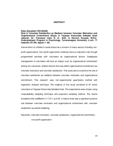 Nuradiati, Rizky (2017) Peran Kepuasan Volunter Sebagai Mediator Antara Motivasi Volunter dan Komitmen Organisasi (Studi Pada Yayasan Komunitas Sahabat Anak Jakarta). Skripsi thesis, Universitas Tarumanagara.