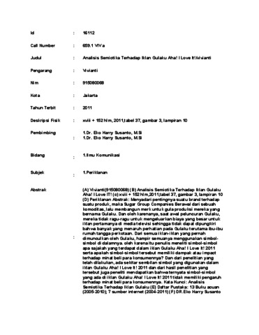 Vivianti, Vivianti (2011) Analisis Semiotika Terhadap Iklan Gulaku Aha! I Love It!/vivianti. Skripsi thesis, UNIVERSITAS TARUMANAGARA.