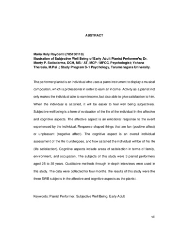 Raydenti, Maria Holy (2017) Gambaran Subjective Well Being Pianis Performer Dewasa Awal. Skripsi thesis, Universitas Tarumanagara.