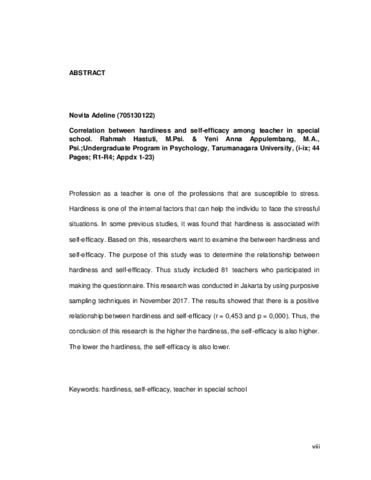 Adeline, Novita (2017) Hubungan Hardiness dan Self-Efficacy Pada Guru Di Sekolah Luar Biasa. Skripsi thesis, Universitas Tarumanagara.