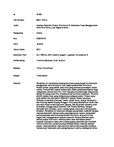 Carina, Carina (2011) Analisis Semiotik Poster Film Horor Di Indonesia Yang Menggunakan Artis Film Porno Luar Negeri/Carina. Skripsi thesis, UNIVERSITAS TARUMANAGARA.