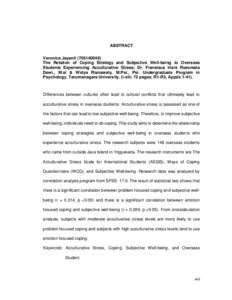 Veronika, Jayanti (2018) Hubungan antara Strategi Coping dan Subjective Well-Being pada Mahasiswa Rantau yang Mengalami Stres Akulturatif. Skripsi thesis, Universitas Tarumanagara.