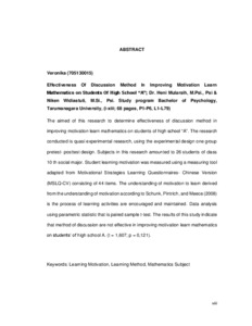 The aimed of this research to determine effectiveness of discussion method in improving motivation learn mathematics on students of high school “A”. The research conducted is quasi experimental research, using the experimental design one group pretest- posttest design. Subjects in this research amounted to 26 students of class 10 th social major. Student learning motivation was measured using a measuring tool adapted from Motivational Strategies Learning Questionnaires- Chinese Version (MSLQ-CV) consisting of 44 items. The understanding of motivation to learn derived from the understanding of motivation according to Schunk, Pintrich, and Meece (2008) is the process of learning activities are encouraged and maintained. Data analysis using parametric statistic that is paired sample t-test. The results of this study indicate that method of discussion are not effective in improving motivation learn mathematics on students’ of high school A. (t = 1,607; p = 0,121).