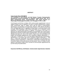"From Burgoon and Ruffner (in Sabati, 2010) communication apprehension is one of negative reaction from an individual in the form of anxiety experienced by a person when communicate. Miller (in Sabati, 2010) said the cause of communication apprehension are self-efficacy and self-esteem. Bandura (1997) defines self-efficacy as an individual belief that he is capable of doing things in a particular situation and succeeds. While Rosenberg (1995) defines self-esteem as an individual's overall assessment of himself either positive or negative. The purpose of this study is to determine the relationship between self-efficacy and self-esteem with communication apprehension focused in students doing oral presentation. This study used purposive sampling technique with total of 402 students. Result shows that self-efficacy with student communication apprehension has a significant negative relationship (r = -0.566 and p = 0.000<0.05). Then, on the self-esteem relationship with communication apprehension in the students also shows a significant negative relationship (r = -502 and p = 0.000<0.05). Meanwhile, result between self-efficacy and self-esteem is a significant positive relationship (r = 0.342 and p = 0.000<0.05). It indicates that there is a positive relation among self-efficacy and self-esteem. Hence, the higher the self-efficacy or self-esteem students have, the lower the communication apprehension felt by them during the presentations.