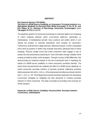 Santosa, Ray Caesarly (2018) Peran Kredibilitas Sumber Electronic Word-of-Mouth (E-WOM) terhadap Niat Beli pada Konsumen E-Marketplace dengan Risiko yang Diterima sebagai Mediator. Skripsi thesis, Universitas Tarumanagara.
