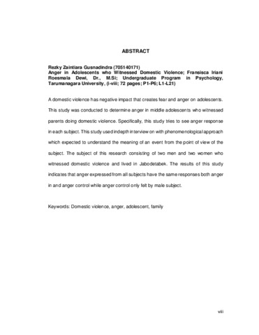 Gusnadindra, Rezky Zaintiara (2018) Anger Remaja Madya yang Menyaksikan Orangtua Melakukan KDRT. Skripsi thesis, Universitas Tarumanagara.