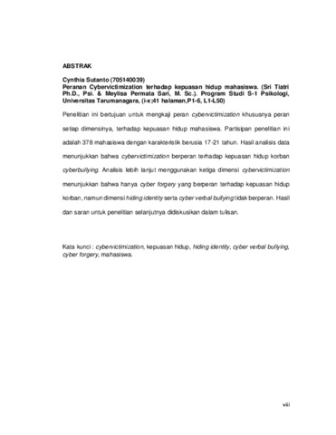 Sutanto, Cynthia (2018) Peranan Cybervictimization terhadap Kepuasan Hidup Mahasiswa. Skripsi thesis, Universitas Tarumanagara.