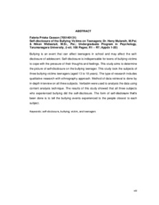 Bullying is an event that can affect teenagers in school and may affect the selfdisclosure of adolescent. Self-disclosure is indispensable for teens of bullying victims to cope with the pressure of their thoughts and feelings. This study aims to determine the picture of self-disclosure on the bullying teenager. This study took the subjects of three bullying victims teenagers (aged 13 to 18 years). The type of research includes qualitative research with ethnography approach. Method of data retrieval is done by in-depth interview on all three subjects. Verbatim were used to analysis the data using content analysis technique. The results of this study showed that all three subjects who experienced bullying did the self-disclosure. The form of self-disclosure that’s been done is to tell the bullying events experienced to the people closest to each subject.