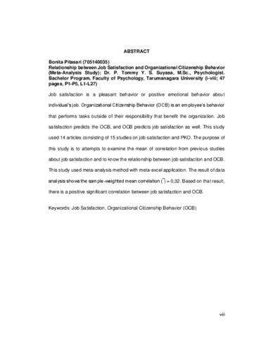 Job satisfaction is a pleasant behavior or positive emotional behavior about individual’s job. Organizational Citizenship Behavior (OCB) is an employee’s behavior that performs tasks outside of their responsibility that benefit the organization. Job satisfaction predicts the OCB, and OCB predicts job satisfaction as well. This study used 14 articles consisting of 15 studies on job satisfaction and PKO. The purpose of this study is to attempts to examine the mean of correlation from previous studies about job satisfaction and to know the relationship between job satisfaction and OCB. This study used meta-analysis method with meta-excel application. The result of data analysis shows the sample-weighted mean correlation ( ̅) = 0,32. Based on that result, there is a positive significant correlation between job satisfaction and OCB.